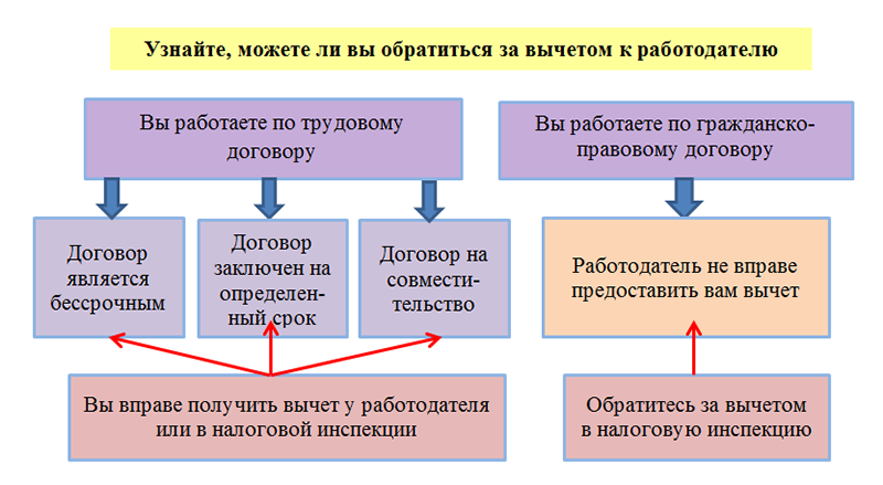Как видно из рисунка, препятствий для получения вычета по месту работы нет у лиц, оформивших с работодателем трудовой договор. При этом не имеет значения срок его заключения (на определенный период или без его указания). Совместители также попадают в категорию работников, для которых доступен вычет по месту работы вне зависимости от размера ставки (0,25; 0,1 и т. д.).