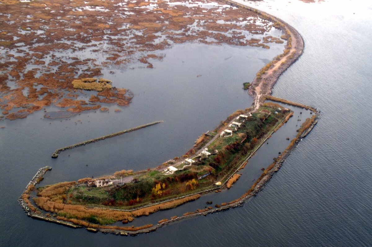 Возвращаясь из Кронштадта, мы целенаправленно решили прорваться на форт 1-й Северный. С КАДа заметили припаркованные у залива машины, оставалось понять как они там оказались. Навигатор показывал параллельную дорогу до форта. Проехать оказалось можно, но дорога грунтовая и очень плохая. Остатки асфальта, лишь добавляли изъяна в покрытие. Потрясло нас знатно. Место оказалось оживленным, но несмотря на это, можно было получить свой уединенный уголок. Люди были с палатками, удочками и лодками. Видно место давно излюблено туристами. Проехав дальше, мы увидели сам форт, но нас остановили ворота, обмотанные колючей проволокой. На покосившейся полусгнившей опоре красовалась надпись "Объект культурного наследия находится под охраной". Пройти дальше было нельзя. Ранее форт был в свободном доступе для посещения до 2019 года, об этом до сих пор свидетельствуют информационные таблички для туристов, расположенные на территории. Немного потоптавшись у входа, мы уже хотели идти обратно, но заметил