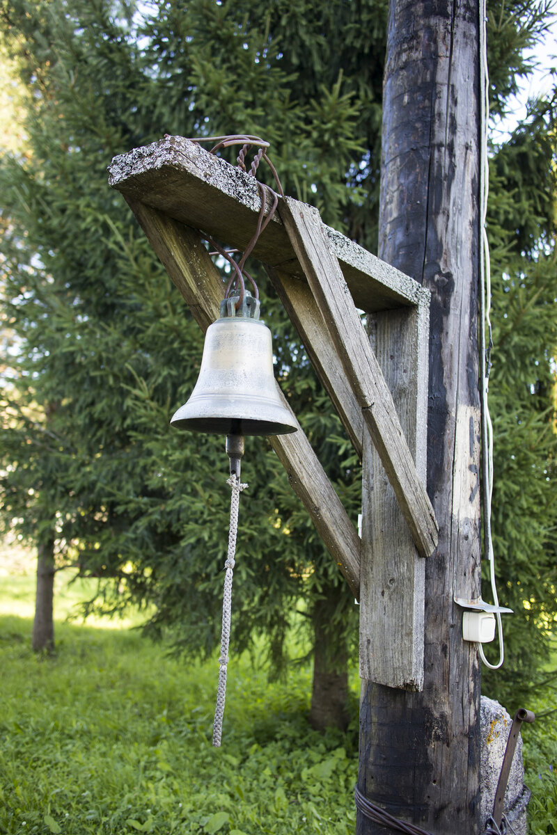 Проехав по прекрасному сосновому бору вы попадаете в небольшую деревеньку, где на окраине видна колокольня и ворота с табличкой.