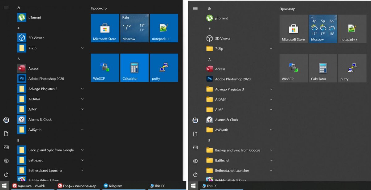 В Microsoft убрали плиточную подложку под иконками, а под «живыми плитками» привели её к полупрозрачному виду. В нашем случае она получилась просто тёмно-серой, акцентный цвет системы мы не меняли, он остался синим. Кроме того, изменился вид папок, они стали более объёмными. Но в новом стиле нам кажется, что плоские выглядели бы как раз эффектнее. При ближайшем рассмотрении можно заметить также, что в высоту меню стало на несколько пикселей короче.