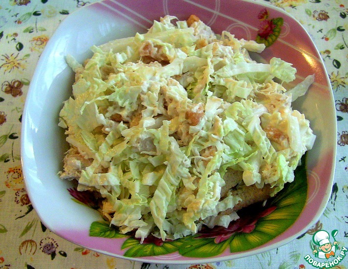 1. Капуста - 300-400 г 2. Колбаса копченая - 200 г 3. Чеснок - 3 дольки 4. Петрушка - 3 веточки (по вкусу) 5. Майонез - 100 г (по вкусу) 6.Соль - 1 щепотка (по вкусу) Приготовление.