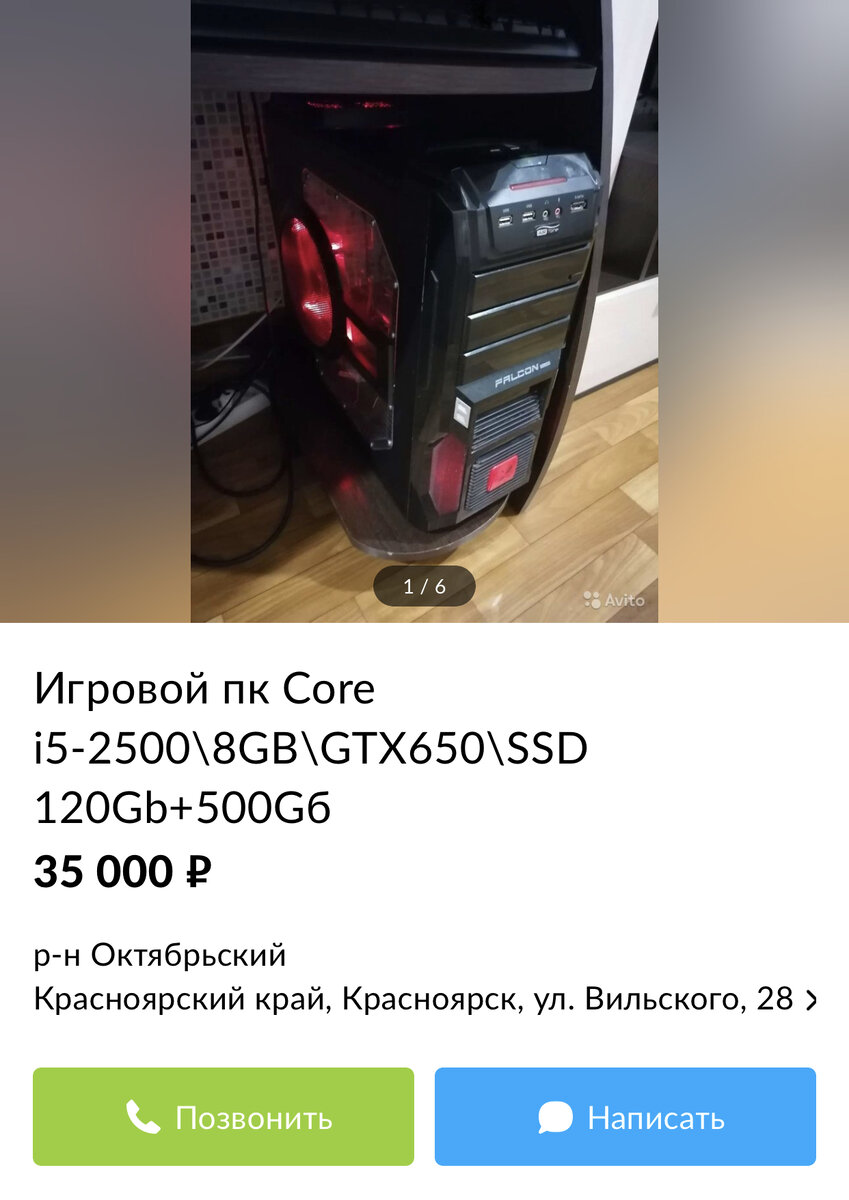 Здравствуйте, я нашёл нового пациента для всеми любимой рубрики «Продаваны», который впаривает пк с GTX650 за 35000. Интересно??? Тогда поехали!!!! Вот. Сама Сборка-обычный «бомж-пк», стоимость которой 12-13 тысяч.Ну15000 максимум. Но там есть ещё блютуз и вай-Фай модуль, за которые наш пациент посчитал должным накрутить 20000 рублей сверху. А теперь плавно переходим к себестоимости «игрового компьютера». 1.Начнем с процессора-I5-2500. 4-х ядерный процессор, которого хватит для кс, танков, дотки и фильмов в FHD. И хоть этот проц разработчики игр любят «впихивать» в минимальные системные требования в играх 2019-2020 года, сидеть на нем сейчас-боль и разочарование. Материнка на LGA1155 сокете, на самом простом-h61 чипсете. Две планки обычной ddr3 памяти от Samsung. По 4гб каждая. Теперь у нас идёт «Игровая» видеокарта с 1гб gddr5 видеопамяти. Теперь наступает очередь Харда. Обычный жд на 500гб. Ничего особенного. Такой же самый обычный ssd на 120гб. Теперь считаем: 1400+1000+2000+1800+