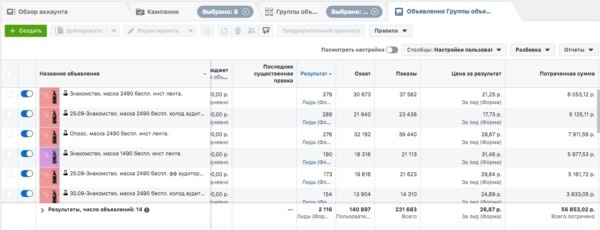Всего мы потратили почти 57 тыс рублей, было более 30 разных видов объявлений, на разные аудитории, с разными креативами и посылами