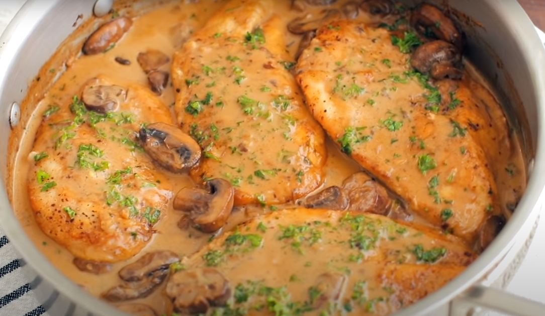 Нарезаем шампиньоны толстыми ломтиками и убираем в сторону. Чеснок и петрушку измельчаем ножом. Разделаем куриные грудки вдоль, так получится 4 кусочка, раскладываем их на доске и накрываем в 2 слоя пищевой плёнкой, будем отбивать их. Если нет мясного молотка, можете использовать скалку, кастрюлю вообщем чем нибудь потяжелее. Солим и перчим целиком куриные грудки, муку насыпаем в плоскую тарелку и обваливаем куриные грудки в муке, стряхивая лишнюю муку. Ставим сковороду с высокими бортами на средний огонь, налив масло для жарки и столовую ложку сливочного масла. Как только сливочное масло растопится, выкладываем куриные грудки в сковороду одним слоем и обжариваем около 3-х минут с каждой стороны, наша задача ее немного подрумянить. Как только обжарим все кусочки, кладём их на тарелку и накрываем фольгой, чтобы она не остыла. На эту же сковороду высыпаем наши грибы, при необходимости добавляем ещё масла и жарим ещё 5 минут, пока они не станут мягкими и золотистыми. Как они обжарятся до