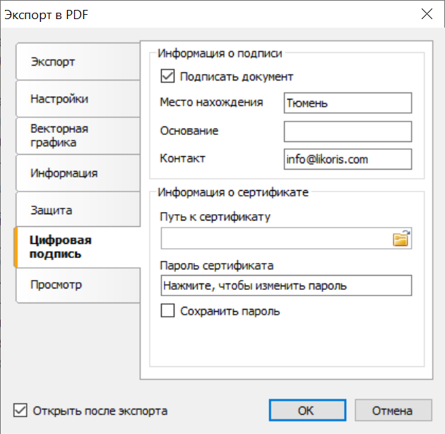 В статье блога компании ЛИКОРИС приведена инструкция подключения электронной подписи при экспорте в pdf-документ из базы данных LIMS myLab.