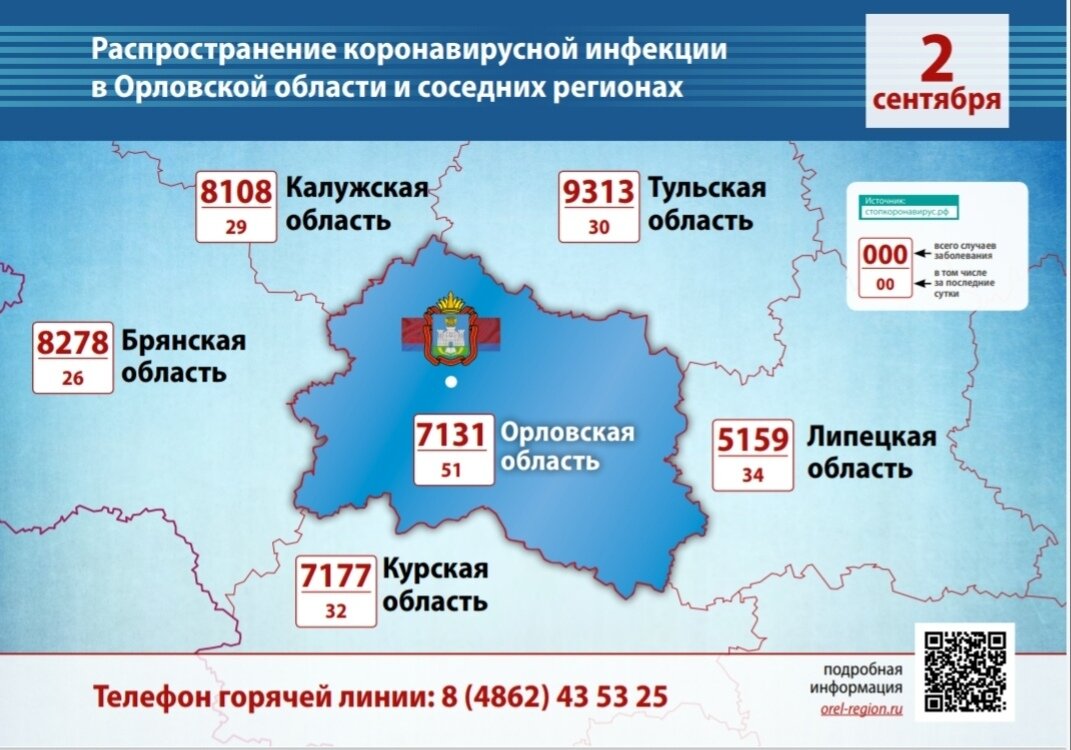 По последним данным оперативного штаба по мониторингу и контролю распространения инфекции, в Орловской области выявлено 51 новых случаев коронавирусной инфекции. Общее число достигло 7131 Кроме того, 5656 человека выздоровели, из которых 34 за последние сутки. За последние сутки был зафиксирован 1 летальный случай пациентов с коронавирусом, на данный момент официально 109 смертей. В связи с этим глава облуправления Роспотребнадзора Александр Румянцев считает, что режим повышенной готовности должен быть продлен, как минимум, до 15 сентября. Это позволит сохранить так называемые «масочный» и «перчаточный» режимы, а также требовать соблюдения других мерых безопасности при проведении массовых мероприятий.