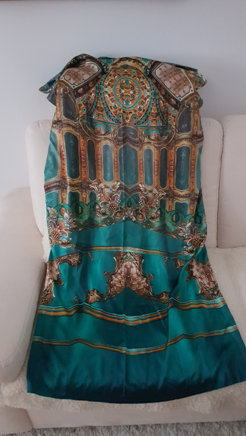 Что имеем- кусок натурального купонного дизайнерского шелка. Сделано в Италии, но это рисунок одного талантливого дизайнера из Санкт Петербурга. Ткань называется " Царская".