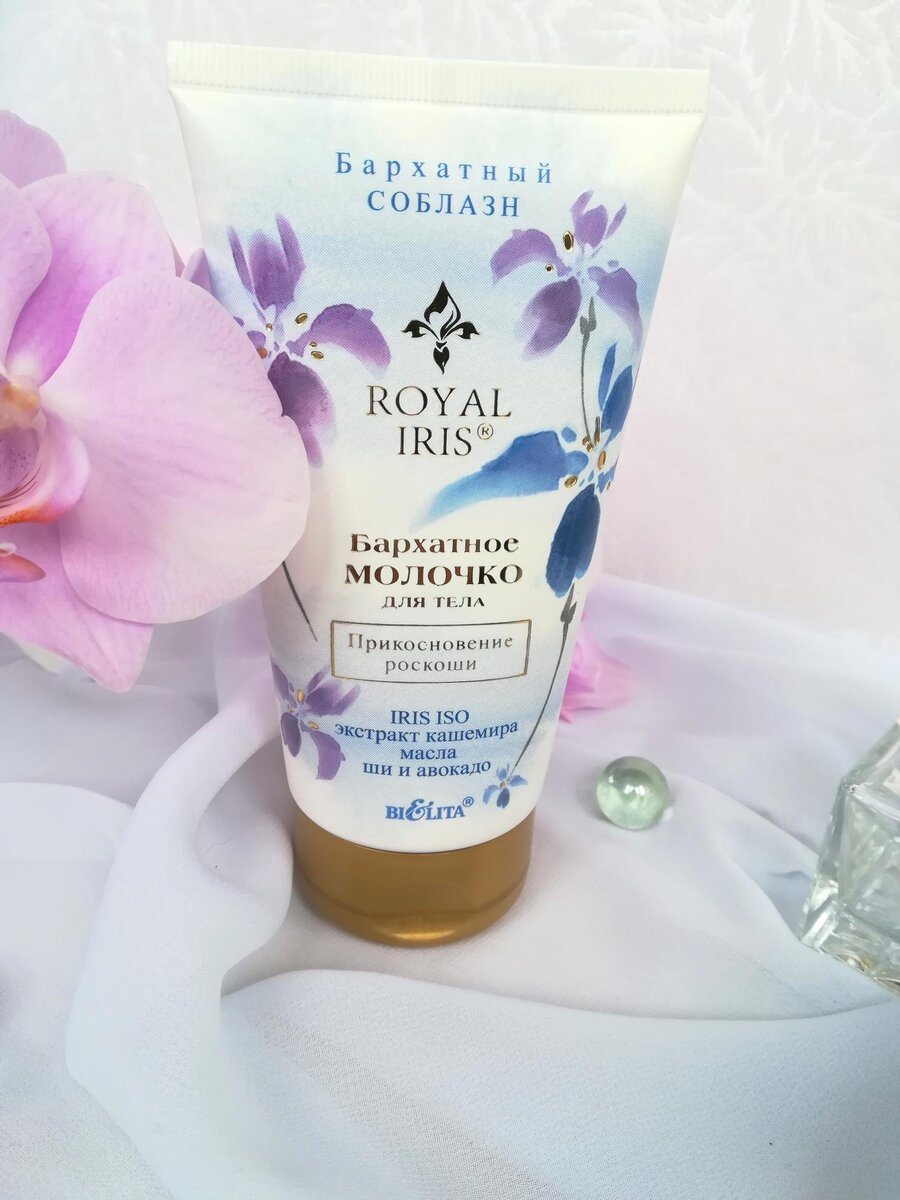Уход за телом это не только приятный, но и полезный ежедневный ритуал. Поддерживать кожу упругой и бархатистой нам помогают различные крема и масла. Согласитесь, ведь это так приятно принять душ, а затем нанести нежное, ароматное средство которое позаботится о нашей коже, устранит сухость и придаст ей мягкость и упругость. Среди подобных средств у меня также есть любимчики к которым я периодически возвращаюсь. И сегодня расскажу об одном из них. Это Бархатное молочко для тела «Прикосновение роскоши» из линии Royal Iris от Белита. Упаковка Упаковано средство в небольшую тубу из мягкого, слегка шероховатого пластика с нежным изображением ирисов и золотистыми надписями. На упаковке можно ознакомиться с наиболее активными составляющими компонентами, способом применения, а также информацией о производителе. Закрыта туба золотистой крышкой в формате флип-топ, на ней предусмотрена небольшая выемка, которая бережёт мои ногти. Под крышкой находится отверстие дозатора идеального размера, позволя