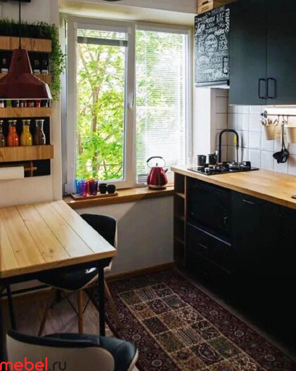 Уютная кухня, правда? Даже и не скажешь, что интерьер полностью придумал и воплотил молодой человек — Павел сам себе дизайнер, и получается у него чудесно. Особенно если посмотреть на ту же кухню до ремонта. Задумываетесь о том, чтобы обновить интерьер? На Mebel.ru найдутся варианты, рассчитанные на любой бюджет. Переходите и выбирайте! Всё как мы любим — убитая отделка, старая мебель, разве что окно в полном порядке. Сложно поверить, что это одно и то же помещение. И ещё одно сравнение: было и стало. Магия вне Хогвартса в действии! Всё ещё думаете, что тёмная мебель и яркие цвета плохо подходят для хрущёвских кухонек площадью меньше 6 квадратов? Показываем фото, которые точно вас переубедят. Ну посмотрите, какая красота! Помещение не кажется слишком тёмным и тесным, чёрные фасады удачно контрастируют и с деревянной столешницей, и с ярким красным холодильником. Кстати, последний — изюминка кухни, без него помещение казалось бы совсем не таким интересным. К эргономике тоже минимум во