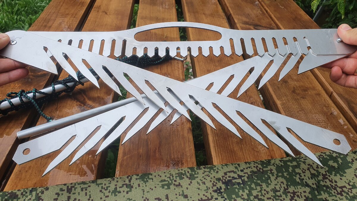 Привет дорогой друг. Для ухода за прилегающий территорией садового участка заимел специальную косу, особой формы. Ее применял в тех местах где триммером невозможно косить, а литовкой не достать. Моя дача находится неподалеку от воды, имеется свой пирс. Водоем теплый и травы ней много. Травка мешает купаться и рыбачить без зацепов. Иной раз приходилось косить водоросли в воде, обычной косой. Но на глубине выше человеческого роста, ей не помашешь. Поэтому прикупил эту необычною косилку. Процесс косьбы с этой спец косой заключается в следующем: Забрасываешь ее на веревке в воду и тянешь. За счет своих зубцов она собирает траву на себе. На косу ложится большое количество травы. Которую необходимо постоянно стряхивать. А потом утилизировать. Честно, мне надоел такой расклад. Решил доработать болгаркой данное изделие. Производитель этой косы, наверняка умышленно сделал основание зубцов "тупыми". Поэтому трава не косилась, а собиралась на косе. Чтоб водоем не захламлялся скошенной т