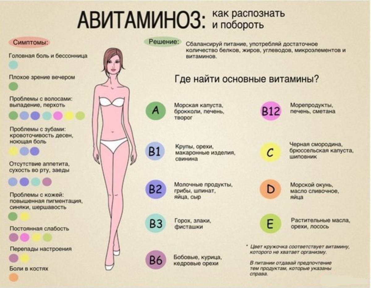 Несколько признаков нехватки витаминов и как восполнить дефицит Итак, если вы заметили, что: 1. У вас часто немеют руки или ноги, ощущение слабости в ногах, частое сердцебиение, ухудшилась память. Это указывает на нехватку тиамина или витамина В1. Восполнить нехватку помогут кукуруза, ржаной хлеб, фасоль, шпинат, пивные дрожжи, морковь. 2. Падает зрение, глаза быстро устают, на эмали зубов появляются трещинки. То вам необходим витамин D. Он вырабатывается под воздействием ультрафиолета. Но он содержится и в некоторых продуктах таких, как растительные масла, обогащенные витаминами, печень трески, камбала, скумбрия, желтки куриных яиц. 3. Вы стали чаще простужаться, на вас навалилась хандра, слабость, невралгия. Это говорит о нехватке пантотеновой кислоты или витамина В3. Старайтесь включить в свой рацион побольше зеленого горошка, говяжьей печени, красной фасоли. 4. Кожа стала бледной, приобрела желтоватый оттенок, десна стали кровоточить, резкая потеря веса, воспаление желудоч
