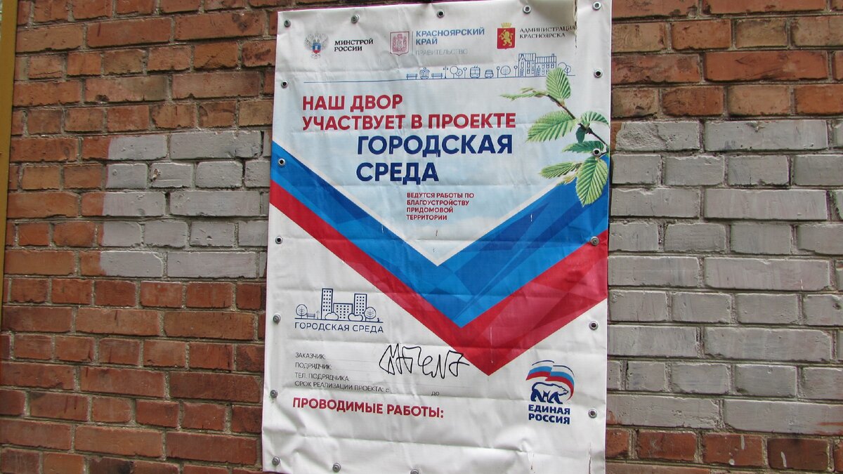 Гласит он, что местный двор участвует в проекте "Городская среда" и что тут ведутся работы по благоустройству территории под эгидой "Единой России".