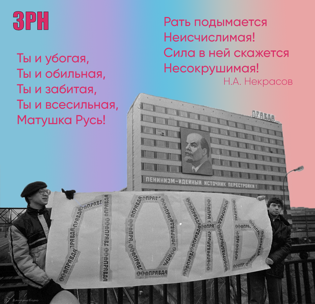 В какие красивые позы встаёт русская интеллигенция от века к веку! За всё хорошее и против всего плохого выступают люди, глотающие из рук пропагандистов яд лживых обещаний. Скорбеть о жертвах революций — и звать на баррикады. Ненавидеть власть — и требовать от неё подчинения западной идеологии. Восхищаться народом, его силой — и презирать его. Алый закат коммунистической идеологии осветил августовский путч 1991 года. Из тьмы перестройки блеснул звериный оскал новорождённого русского капитализма. Тогда все поверили обещаниям демократов о жизни «как на Западе», но не протрезвели от дурмана большевизма. Идеология того времени была основана на страхе перед силой власти и преклонении перед любыми чиновниками. Это и сыграло с Россией злую шутку: на смену единственной верной точке зрения пришла разноголосица 90-х, а воспитанная большевиками вера в то, что люди у власти знают, как лучше, — осталась. Народ соглашался страдать. Так велика наша потребность в объединении вокруг большой мечты о