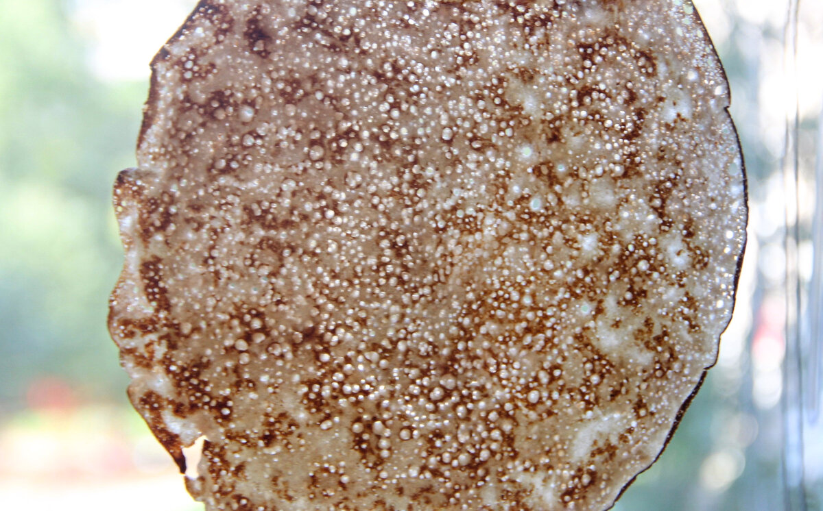 Наше тесто подошло, можно приступать к выпеканию блинов. Как я уже говорила, блинчики получаются в дырочку.