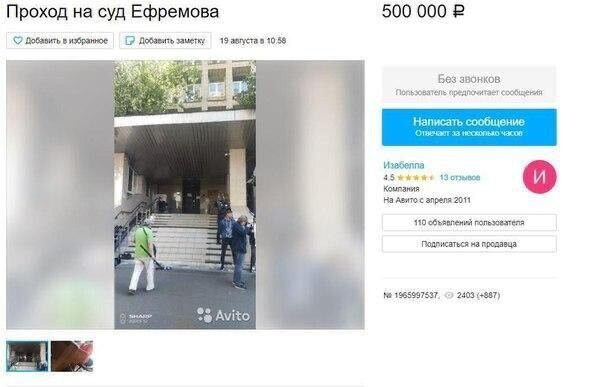 🎫 На авито появилось объявление о продаже билетов за 500 тысяч рублей на заседание суда по делу Ефремова