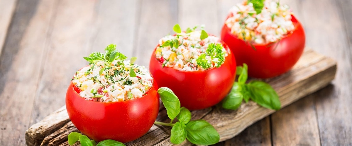 ⠀ Отличная закуска, которая вполне может быть самостоятельным блюдом, если хочется чего-то лёгкого. Постному майонезу есть альтернативная замена: измельчённые орехи кешью с добавлением лимонного сока ⠀ Ингредиенты: • Томаты – 6 шт. • Кукуруза консервированная – 100 г. • Горошек консервированный – 100 г. • Сыр VolkoMolko «С ароматом копчения” – 100 г. • Огурец свежий – 1 шт. • Постный майонез – 50 г. • Укроп – 1 пучок. • Базилик – 1 веточка. ⠀ Приготовление: ⠀ У томатов отрезать верхнюю часть, с помощью ложки удалить середину. Огурец очистить от кожуры, нарезать мелкими кубиками. Измельчить укроп. Сыр нарезать мелкими кубиками, соединить с огурцом, кукурузой, горошком, укропом и постным майонезом. Размешать, распределить по формам – помидорам, украсить базиликом. Bon Appetite! ⠀ #volkomolko #волкомолко #веганка #веганскоеменю #веганскийсыр #рецепт#фаршированныетоматы #фаршированныепомидоры #веганскийрецепт#постныйрецепт