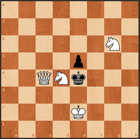 Предлагаю решить очередную шахматную задачу. Автор Л. Полгар 2001 год. Белый конь под боем черной пешки е5. Если белый конь уйдет с d4, то черный король может уйти через поле f5. Но белые начинают, и ставят мат в 2 хода.