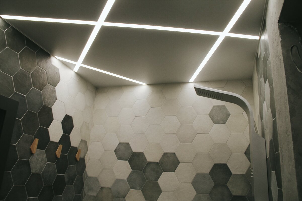 Привет, друзья! В прошлом посте мы рассказывали о световых линиях на потолке в санузле. Сегодня покажем, как происходит установка линий на натяжной потолок. 1 этап: Устанавливаем багет. Есть два варианта: ПВХ (фото 1) и алюминиевый (Eurokraab). 2 этап: Устанавливаем профиль для светодиодной ленты (фото 2). 3 этап: Монтируем светодиодную ленту в профиль (фото 3). 4 этап: Натягиваем натяжное полотно (на фото 4 матовое полотно MSD). 5 этап: Устанавливаем пластиковую заглушку (фото 5). Частые вопросы: Как менять при перегорании диодов? Снимите рассеивающую заглушку. Поменяйте ленту. Установите заглушку обратно. Это можно легко сделать самостоятельно или вызвать сервисную бригаду. Сколько держится освещение без замены? Срок службы зависит от модели ленты и блока питания. Производитель Arlight заявляет более 30 тысяч часов. Как узнать стоимость световых лини на натяжном потолке? Для расчета цены нужен выезд технолога. Узнать какие у вас стены, сколько углов, как эти углы можно обход
