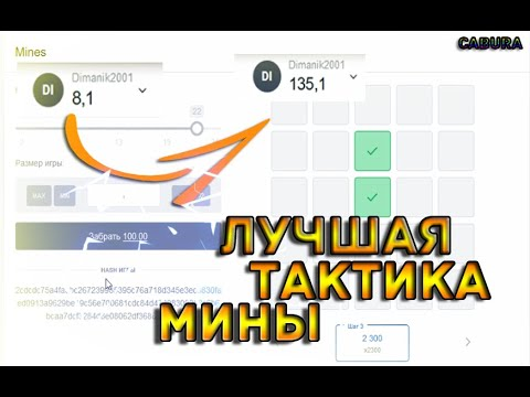 Сам сайт : Cabura.bar Рекомендуемый баланс 193 рубля. Тактика: Ставим 11 мин. Ставка 23 рубля, открываем 1,3,5. В случае поражения ставим 35 рублей и открываем 2-й ряд 2,4,5. Но если и сейчас проиграли то ставим 6 мин, 135 рублей и открываем 1,3,5, 2-й ряд 1,2,5. В случае успешного выполнения одного из пунктов возвращаемся к началу. Также Вы можете менять сумму ставки в зависимости от баланса.