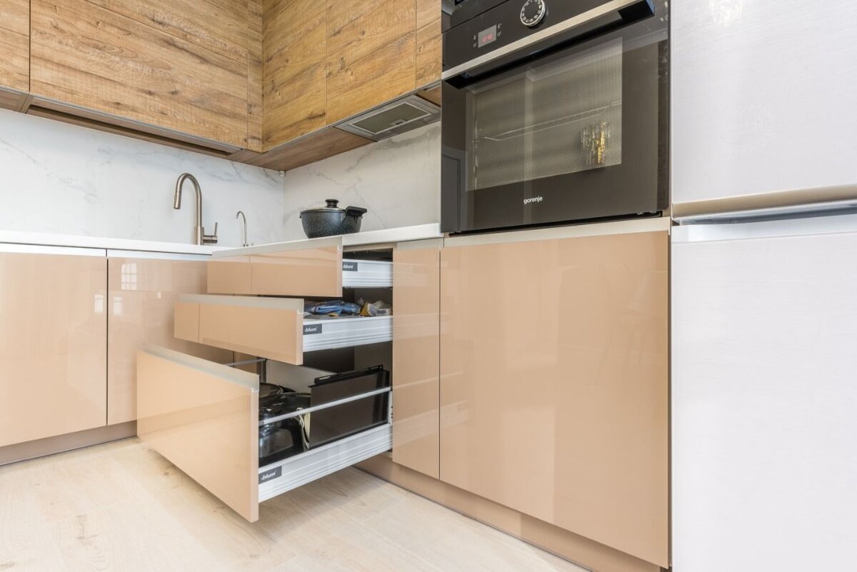 ▫️ Материал нижних фасадов и верхних антресолей - Акрил (Испания) - безупречный глянец, зеркальный эффект, отражает свет и увеличивает пространство ⠀ ▫️ Верхние фасады из TSS плиты Cleaf (Италия) - делают интерьер невероятно модным и в том числе практичным ⠀ ▫️ Столешница сделана из акрилового камня - белая, в цвет фартука и белых холодильников ⠀ ▫️ Бытовая техника, как чёрного, так и белого цвета. Если вы боялись делать такие сочетания, то посмотрите, как хорошо получилось! ⠀ ▫️ Кухня очень функциональна - нижние шкафчики выдвигаются - установлены тандембоксы BLUM, предусмотрено карго, посудомойка и вместительные шкафы для мелкой бытовой техники ⠀ ▫️ Вытяжка полностью встроена в шкаф и не нарушает минималистичный дизайн ⠀ ▫️ Верхние шкафчики: - в шкафу с сушкой для посуды и соседний шкаф - установлены подъёмный механизм Aventos HF от BLUM - это обеспечивает быстрый и удобный доступ к самым используемым шкафам на кухне - в остальных установлены петли с доводом BLUM - длинные горизонтал