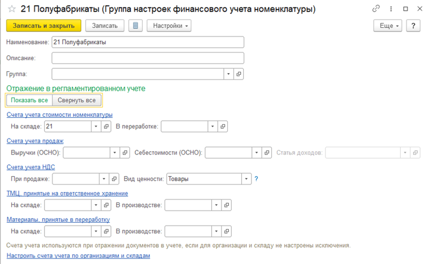Для отражения выпуска полуфабрикатов на склад и отражения выпуска в учете на счете 21 необходимо создать группу финансового учета с соответствующими настройками счетов учета:
