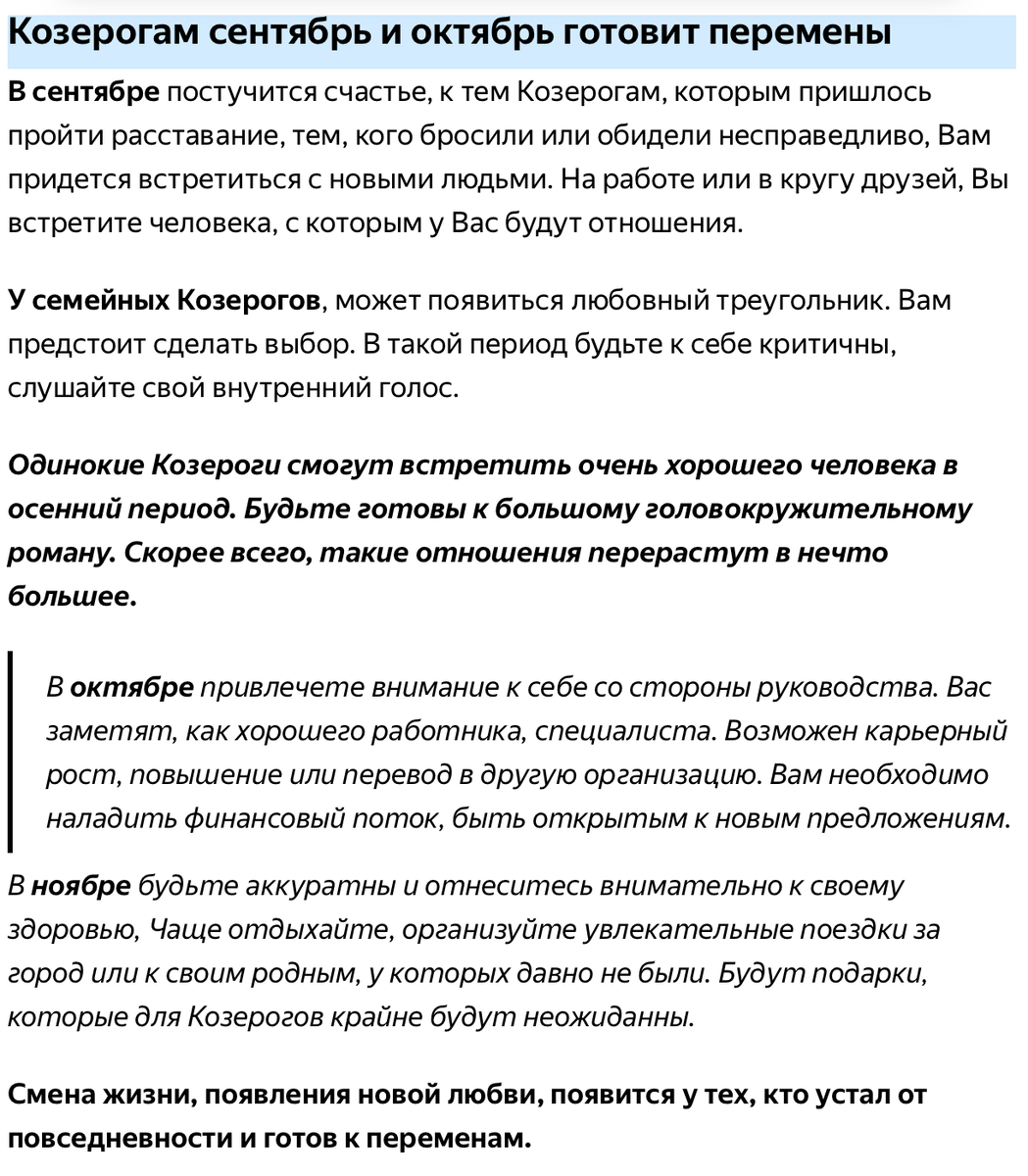 Вот и дошла очередь до самых умных знаков зодиака Козерогов. Вы прошли не простой период за последние 2 года и скоро звезды будут вас благословлять и подарят вам ветер перемен. Луна в осенний период полностью нивелирует влияние недружественных вашему знаку небесных тел и откроет путь вашим планетам. Обо всем этом более подробно я расскажу в данной работе, написание которой я закончил только вчера. Было бы замечательно, если бы вы оставили свои комментарии. Важно Козероги Специально для вас мы создали онлайн гадание на Цыганских картах, с помощью которого узнаете о своем будущем. Пройдите по ссылке ниже и смотрите расклад: Приступить к гаданию на будущее