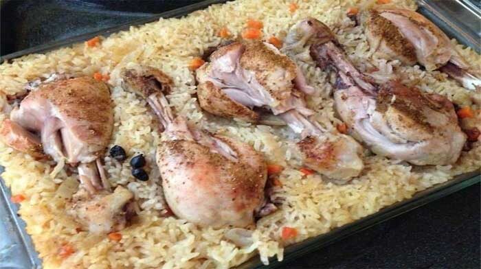 Следующий слой - 2 стакана риса. Посыпать чуть солью, перцем, раскрошить кубик для куриного бульона. Добавить 3 стакана кипятка.