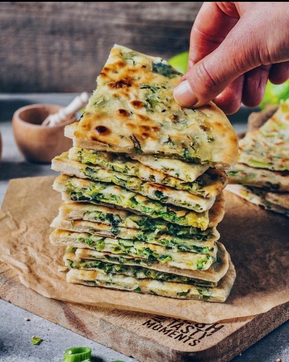 ⠀ Это блюдо открыто к творчеству. Его можно подать отдельно, им можно дополнить суп или преподнести к гарниру! Ставьте лайк и вдохновляйтесь нашими рецептами . Ингредиенты: ▪️250 гр муки ▪️3/4 ч.л. соли ▪️180 мл теплой воды ▪️1 чашка* мелко нарезанного зеленого лука *1 чашка=240 мл ▪️4 ст.л. растительного масла ⠀ Как готовить: В большой миске смешайте муку и соль. Затем налейте воду и перемешайте, пока вся вода не впитается. Замесите тесто (если после небольшого замеса тесто еще сухое, добавьте еще 1-2 ст.л. воды). Перенесите тесто на рабочую поверхность и продолжайте вымешивать, пока тесто не станет мягким. Скатайте тесто в круглый шар. Накройте влажным полотенцем и оставьте на 20-30 минут. Разделите тесто на 4 части равного размера и скатайте их в шарики. На слегка посыпанной мукой рабочей поверхности раскатайте один шарик. Смажьте получившуюся лепешку маслом и посыпьте зеленым луком. Сверните тесто в улитку. Затем с помощью скалки снова раскатайте его. Повторите с оставшимися кус