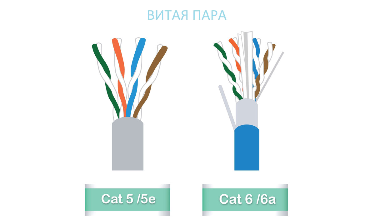 В большинстве случаев категория провода указывается маркировкой на оболочке. Цветовых различий нет, но кабели CAT6 в большинстве случаев толще, чем кабели CAT5e, потому что в них используются медные провода большего сечения.