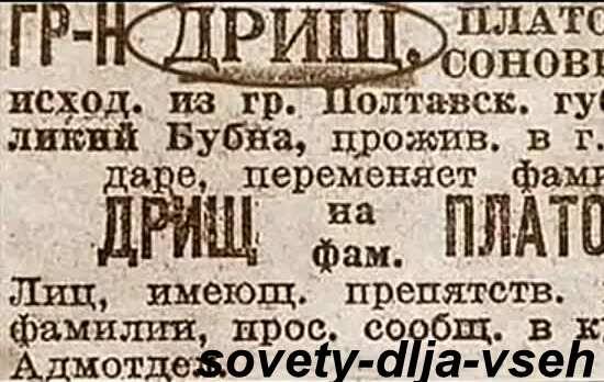В 30-е годы XX века произошла важная эпоха в общей истории фамилий. В России всем желающим предложили поменять свои неблагозвучные фамилии. В отделы регистраций потянулись целые очереди людей с самыми необыкновенными фамилиями. Газета «Известия» успела зафиксировать этот исторический момент: благодаря ей, мы располагаем списком тех фамилий, которые навсегда исчезли в 30-е годы прошлого века:
