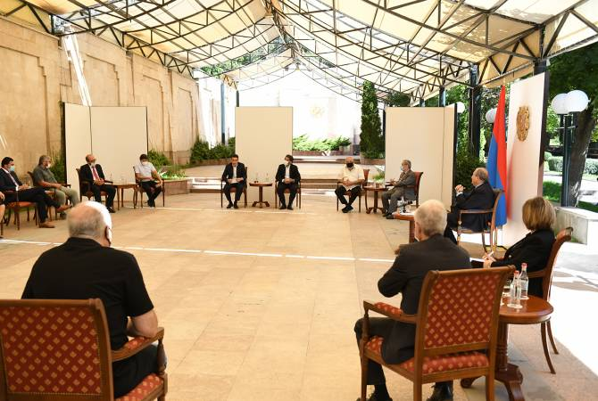 Президент Республики Армения Армен Саркисян 26 августа встретился с руководителями ряда учреждений культуры Армении. Во встрече приняли участие художественный руководитель и главный дирижер Национального филармонического оркестра Армении Эдуард Топчян, художественный руководитель и главный дирижер Государственного симфонического оркестра Армении Сергей Смбатян, руководитель камерного хора Армении Роберт Млкеян, дирижер и художественный руководитель хора “Маленькие певцы Армении” Тигран Экекян, директор Национального академического театра им. Г. Сундукяна Вардан Мкртчян, художественный руководитель театра Армен Элбакян, художественный руководитель главный режиссер Государственного театра музыкальной комедии им. Пароняна Акоп Казанчян, который одновременно является и председателем Союза театральных деятелей Армении, художественный руководитель Драматического театра им. Г. Капланяна Армен Хандикян, художественный руководитель Государственного кукольного театра им. О. Туманяна Рубен Баб