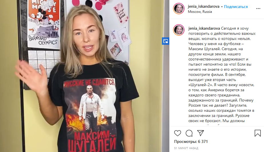 Печальная история российских ученых Максима Шугалея и Самера Суэйфана привлекает внимание все большего числа людей. Не только дипломатов и общественников, но и обитателей медиапространства. Звезды отечественного шоу-бизнеса запустили в Instagram флешмоб в поддержку российских социологов. Каждый участник акции облачился в футболку с кадром из фильма «Шугалей». Знаменитости в соцсетях рассказывают о пленных российских ученых и о предстоящей премьере фильма «Шугалей-2». Блогеры запустили флешмоб в Instagram, чтобы поддержать российских социологов Так, стендап-комедиантка Женя Искандарова опубликовала видео в поддержку Шугалея и Суэйфана. Она считает, что о таких важных вещах молчать нельзя: «Человек у меня на футболке – Максим Шугалей. Сегодня, на другом конце земли, нашего соотечественника удерживают и пытают непонятно за что! Если вы ничего не знаете о его истории, посмотрите фильм. В сентябре, выходит уже вторая часть «Шугалей-2». Искандарова добавила, что Россия должна сражаться з