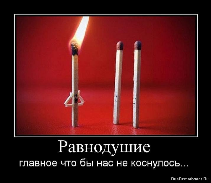 сегодня я расскажу о человеческом равнодушии,и том почему люди не помогают друг другу . начнем с того что подразумевает под собой равнодушие. люди проходят мимо если кто то лежит на земле , если кого то бьют средь бело дня то никто не поможет , если угоняют:велосипед,мотоцикл,машину. всем насрать. люди думают что это не их проблема и они не должны никому ничего ,,значит я пройду мимо,, если помогать лежачему на земле человеку , можно испачкаться,попасть в преступление , или что то такое . бьют человека- люди пройдут мимо ведь можно получить самому , а этого боятся многие,люди думают что найдется кто то другой но не я. люди и полиции не доверяют . это огромная проблема проблема ведь когда сам пытаешься решить проблемы то они могут и погубить и самого ,,решалу,, . угон авто вобще людей не беспокоит если им надо то пусть сами найдут , хотя если бы сообщали все кто видел как что то угоняют.то ни что не угоняли бы , глаза найдутся всегда а будет ли пот ними рот , это вопрос но когда люди