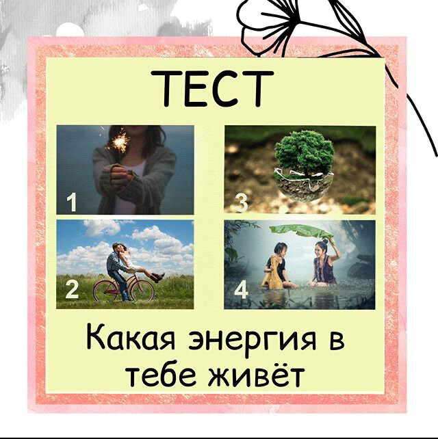 Выбери картинку, которая по душе и она расскажет тебе о твоей характере, твоей стихии. Посмотри на эти 4 таких разных картинок и выбери, какая тебе понравилось больше . Номер картинки пиши в комментариях ✍🏻 1. Огонь 🔥 Если ты выбрала картинку с бенгальским огоньком, значит ты обаятельный и очень активный человек. Ты легко влюбляешь в себя людей, с тобой весело проводить время. Ты искренний и добрый человек. Твоя стихия – огонь. Чтобы тебе побыстрее восстановить свои силы и насытиться положительной энергией чаще отдыхай у костра или камина. Можно дома завести несколько аромасвечей, и лицезреть маленьким огоньком. . 2. Воздух 💨 Если тебе понравилась картинка с велосипедом, значит ты – человек, который любит свободу и просторы, ты – воздух. Тебе нравятся покорять новые просторы, путешествовать и отдыхать на природе. Чтобы пополнять энергетические запасы тебе нужно чаще гулять на свежем воздухе, отдыхать в лесу или кататься за городом на велосипеде. . 3. Земля 🌍 Если тебе понр
