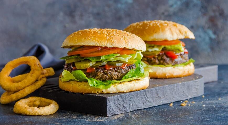 У современной версии бургера существует множество разновидностей. Этот рецепт - самый классический, минималистический и вкусный. Если пропорции постного мяса и жира соблюдены правильно, то такой котлете не надо никаких приправ, разве что соль и перец. ИНГРЕДИЕНТЫ Для луковых колец: ПОШАГОВЫЙ РЕЦЕПТ ПРИГОТОВЛЕНИЯ Шаг 1 Вырезку зачистите от пленок и сухожилий. Мясо и сало хорошенько промойте и крупно нарежьте. Шаг 2 Проверните через мясорубку мясо вместе с жиром. Лук очистите и очень мелко нарежьте. Разогрейте в сотейнике оливковое масло, выложите лук и тушите на тихом огне, пока он не станет светло-коричневым и не отдаст естественный сахар. Шаг 3 В фарш добавьте тушеный лук, очень мелко нарезанные листья петрушки, желтки, горчицу, ворчестерский соус, соль, перец. Хорошо вымесите фарш руками. Шаг 4 Возьмите плоский противень или лоток, смажьте его оливковым маслом. Смоченными в воде руками слепите котлеты для бургеров по 140–150 г каждая и выложите в лоток. Отправьте котлеты в морози
