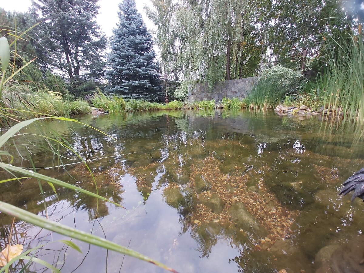 На фото выше вы видите искусственный водоём с рыбой . Это фото было сделано 26.08.2020. Но мало кто знает что стоит за этой прозрачной водой. Первое и не мало важное действие - это обслуживание. На протяжении всего лета , один раз в две недели , бригада из двух человек выезжает для очистки фильтрации от иловых отложений и отходов жизнедеятельности рыбы. Каждый выезд сопровождается забором анализа воды на жёсткость для последующего внесения бактерий для борьбы с нитивидными водорослями . Многие заказчики кормят рыбу каждый день, думая что она без корма может погибнуть, но это не так. Кормя рыбу , вы превращаете водоем в подобие лужи Вот во что можно превратить хороший водоём. Частое кормление рыбы способствует быстрому замедлению воды и засору фильтрации . Рыбу нужно кормить раз в неделю , а при температуре воды выше 20 градусов лучше воздержаться от кормления , она не погибнет и ни чего с ней не случится.