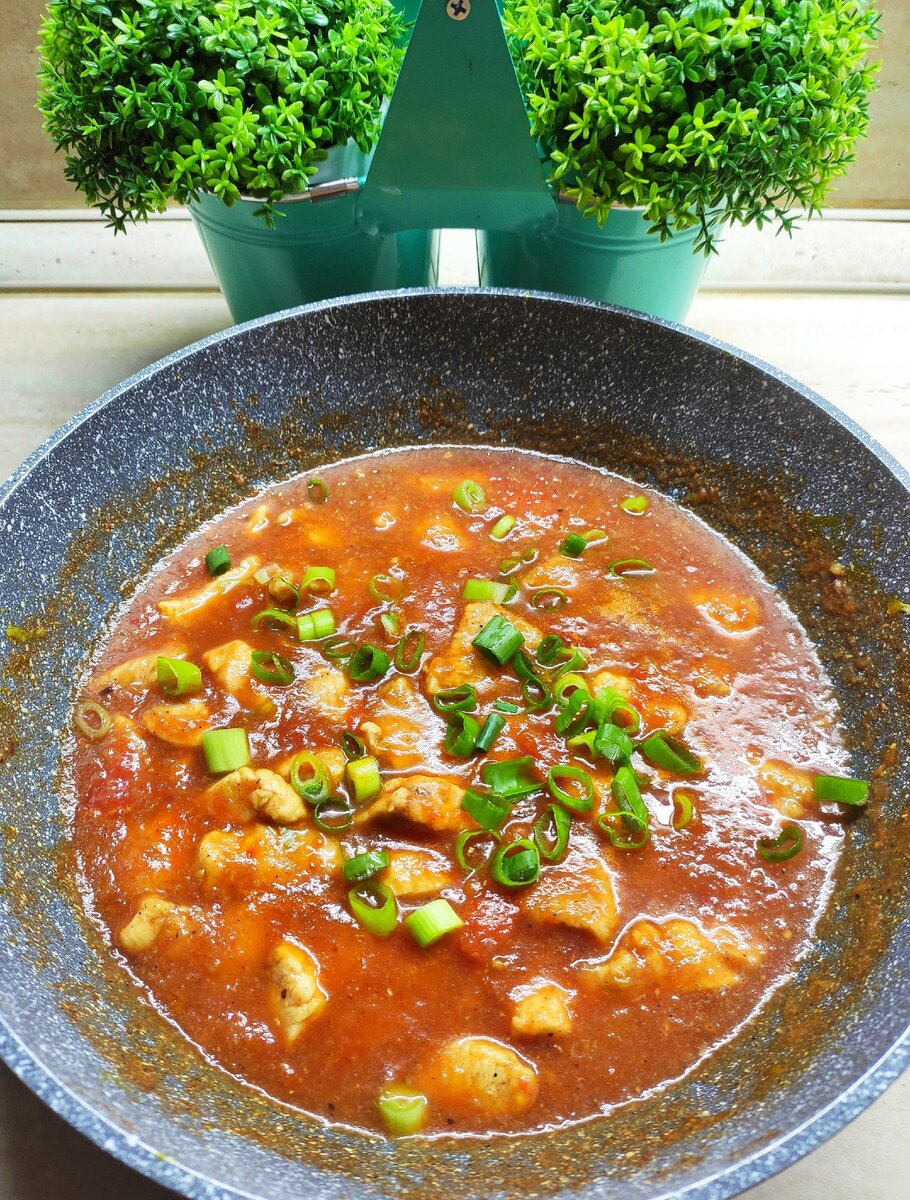 Курица, тушеная в луково-томатном соусе - пикантный вкус и интересное приготовление.