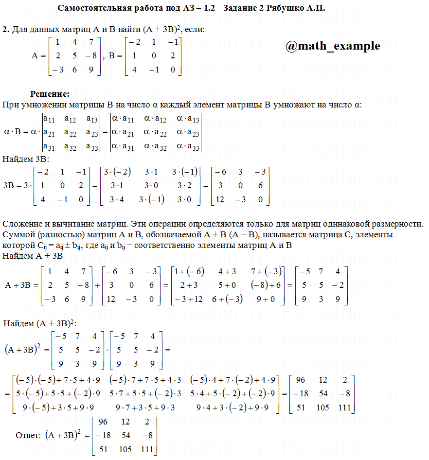 Нахождение (A+3B)2 для матриц A и B СРС 1.2 - Задание 2 Рябушко А.П.