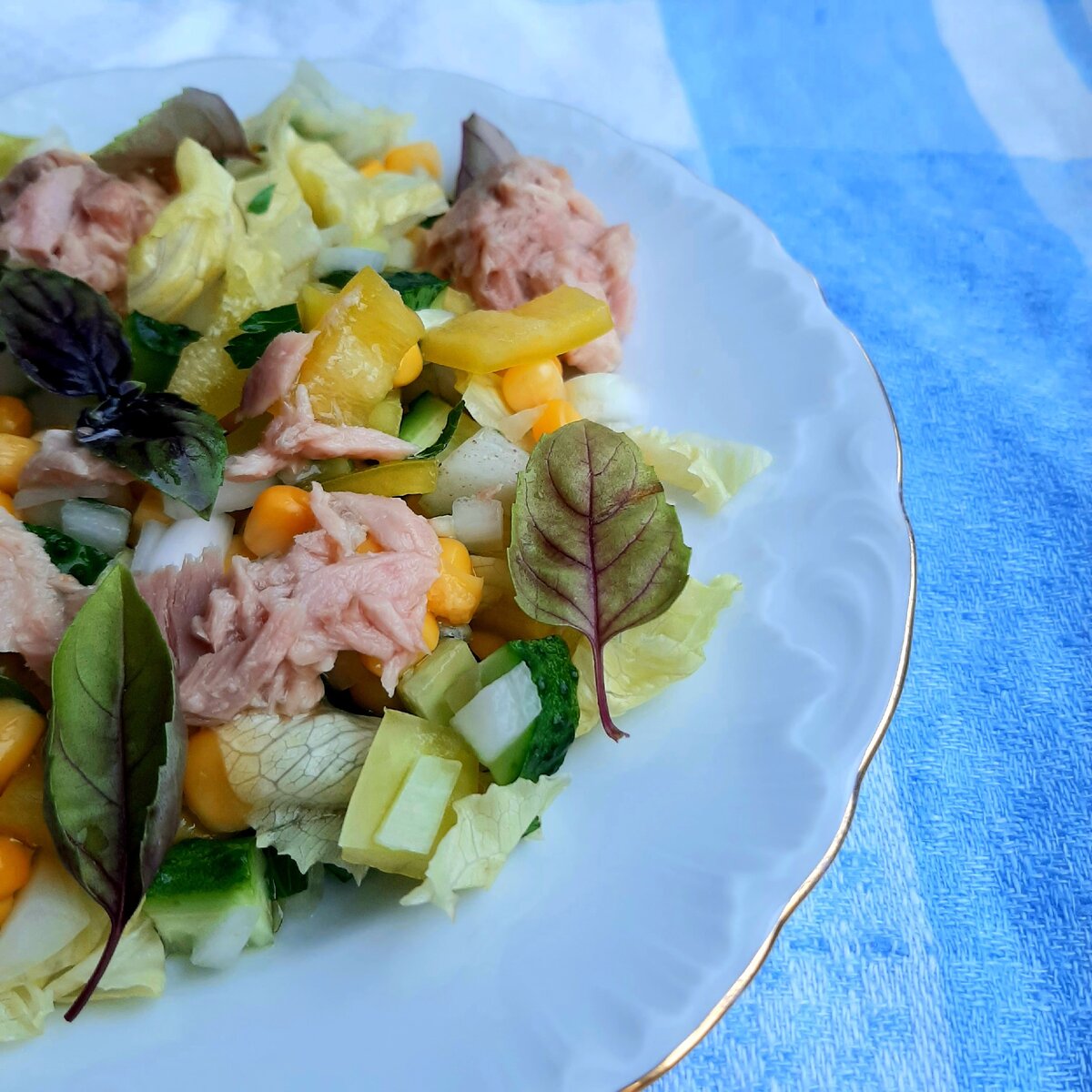Тунец - морская хищная рыба. Мясо тунца - это низкокалорийный продукт, ценится за его питательность, большое содержание омега-3, омега-6. У тунца очень хорошо развиты мышцы, и поэтому вкус его мяса не похож на рыбу. Здравствуйте, дорогие читатели! Меня зовут Наталья, и я приветствую вас на своем канале. Присоединяйтесь к моему каналу всегда рада новым знакомствам. Сегодня предлагаю приготовить лёгкий и витаминный рыбный салат. Для приготовления нам понадобятся: Тунец консервированный - 1 банка Кукуруза консервированная - 1/2 банки Перец болгарский (лучше красного цвета) - 1 шт. Огурец свежий - 2 шт. Лук репчатый - 1/2 шт. Листья салата - 3 шт. Петрушка свежая - 3 веточки Базилик свежий - 1 веточка Масло оливковое - 2-3 ст.л. Соль по вкусу Перец чёрный молотый по вкусу. Овощи и зелень помыть, обсушить, почистить. Лук нарезать кубиками, и если не хотите горечи в салате, обдать кипятком. Огурец и перец нарезать небольшими кубиками. Салат нарвать или нареза