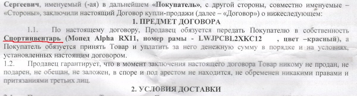 Заодно беру с собой договор купли – продажи, где четко написан номер рамы и указано, что мопед является спортинвентарем.