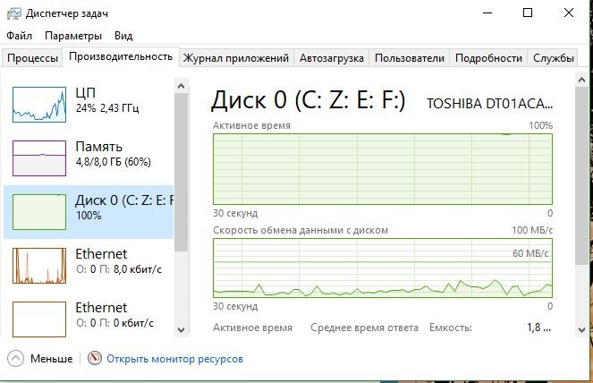 Как видно, во вкладке Производительность, жесткий диск загружен на 100%, а оперативная память и процессор использованы не полностью.