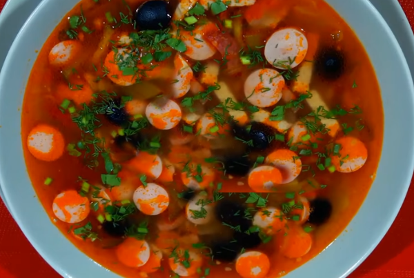 Доброго времени суток, дорогие читатели! Солянка - это вкусный, необычный и питательный суп. Сочетание копченостей, соленых огурцов и маслин придают изысканный и неповторимый вкус. Для приготовления солянки вам понадобится: можно добавить вареную колбасу, сосиски или ветчину 100-150г Итак, начнём готовить. 1) Лук мелко нарезаем кубиками. 2) Морковь тоже режем мелко - кубиками, полукружочками, полосками (на ваш вкус) 3) На смазанной растительным маслом сковороде обжариваем лук и морковь. 4) К приготовленным луку с морковью добавляем копчености. Перемешиваем и даем постоять пару минут на огне. 5) Ставим параллельно кастрюлю с водой на огонь. Доводим до кипения. Закидываем картофель, нарезанный средними кубиками. 6) В сковородку с овощами и копченостями добавляем мелко нарезанные соленые огурцы и томатную пасту. Тушим 10-15 минут. При надобности можно добавить немного воды, чтобы не подгорело. 7) Перекладываем жареную заправку в кастрюлю с картофелем. Перемешиваем, солим, перчим. 8) За