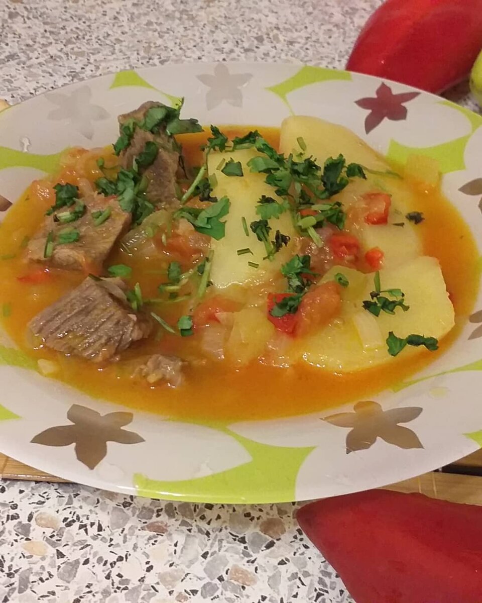 Как приготовить блюдо из говядины быстро и вкусно. Предлагаю Вам приготовить на обед или ужин блюдо из говядины быстро и вкусно. Блюдо очень вкусное и ароматное. Понравится думаю всем. ✅Ингредиенты: Мясо (говядина или баранина) 500 гр. Картофель 3 шт. Помидор 3 шт. Сладкий перец (красный зеленый) добавляйте на свой вкус- 1-2 шт Лук репчатый- 1 шт. Масло (подсолнечное или сливочное) 1)Заранее советую приготовить мясо, так как мясо варится не менее часа. Помойте и разделите мясо на небольшие кусочки. После готовности бульон оставляем, просто во время варки мясо, убирайте всю образовавшуюся пену. 2) Заранее нарезанный лук нужно чуть обжарить и добавить к нему мясо. Тушим лук с мясом пару минут. 3) добавляем нарезанные помидоры и сладкий перец. Кстати можно добавить и острый перец, все зависит от ваших предпочтений. Все хорошенько перемешайте и оставьте пару минут тушится. 4) добавьте картофель а затем и мясной бульон. Посолите. 5) закрываем крышкой, доводим до п