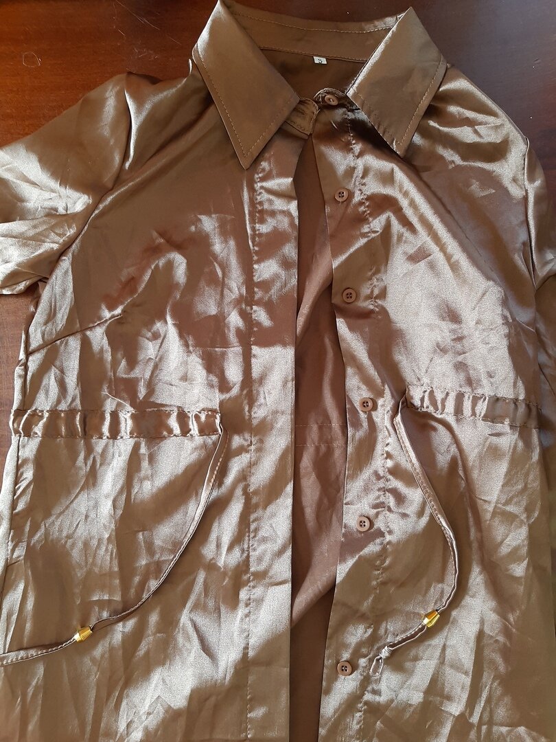Купила вещь, так как очень понравилась ткань, цвет - такой одежды у меня ещё не было. Приятный золотистый оттенок сразу привлёк внимание, и я однозначно решила, что куплю блузку.