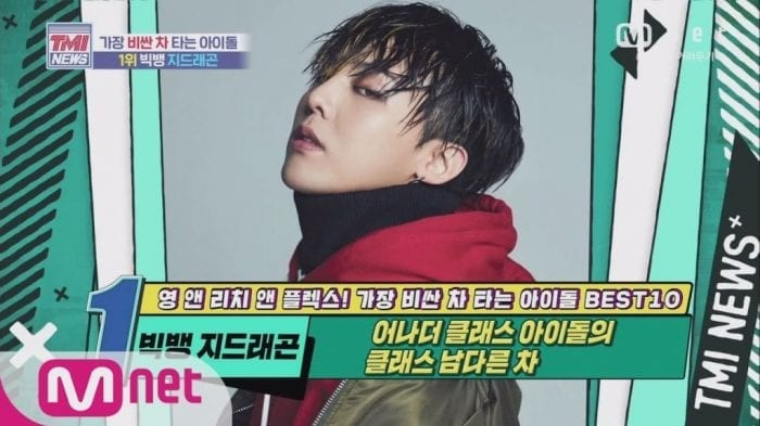 В выпуске TMI News от 26 августа были представлены самые дорогие автомобили, принадлежащие звездам-айдолам. G-Dragon занял первое место с Lamborghini стоимостью 570 миллионов вон (480 238,62 долларов США), Rolls-Royce Phantom стоимостью 740 миллионов вон (623 531,10 доллара США) и Bentley стоимостью 390 миллионов вон (328 617,74 доллара США). Стоимость всех автомобилей участника BIGBANG составляет 1,6 миллиарда вон (1 348 185,84 доллара США). Посмотрите на других звезд, которые попали в этот рейтинг, ниже. 2-е место — YUMDDA 3-е место — Чанёль (EXO) 4-е место — Донван (Shinhwa) 5-е место — Джей Пак 6-е место — Джессика 7-е место — Beenzino 8-е место — Юна (Girls’ Generation) 9-е место — Ли Хёри 10-е место — Ан Джи Ён (BOL4)