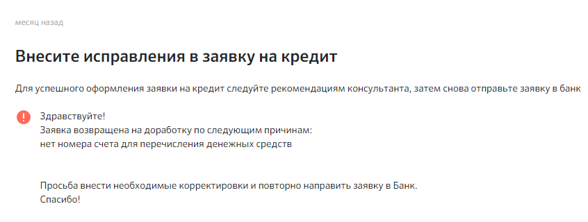 На следующий день пришло смс, что заявка требует доработки. Когда я попробовала войти в личный кабинет домклик, увидела такое сообщение: