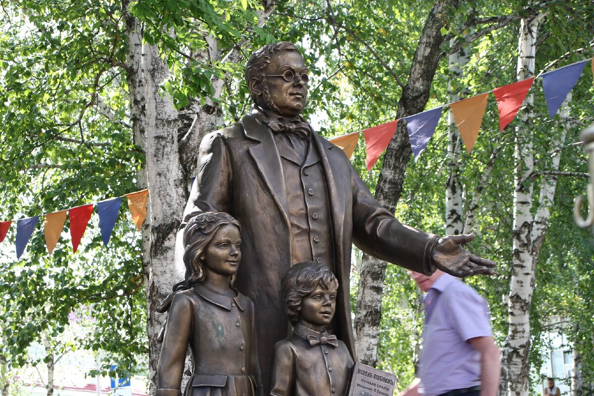 Скульптуру «Сказочник Петр Ершов и дети» установили у Тюменского театра кукол . Скульптура дополнила уже существующий ансамбль — бронзовую фигурку Конька-Горбунка и витраж с пером Жар-Птицы.