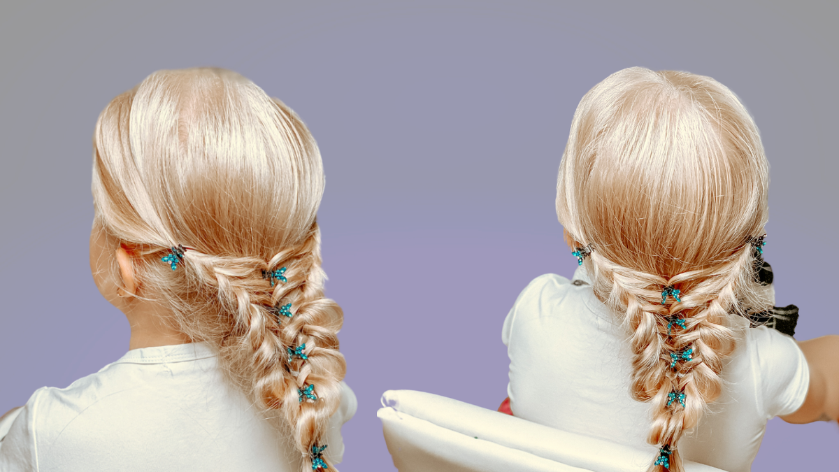 С каждой стороны отделяем тоненькие пряди и закрепляем сзади с помощью резинки. Ниже отделяем следующие две тоненькие пряди, продеваем снизу вверх каждую прядь через закрепленные ранее пряди и фиксируем резинкой. И так далее повторяем те же действия. Доплетаем до конца хвоста и фиксируем резинкой. Можно украсить резинкой. Прическа готова!