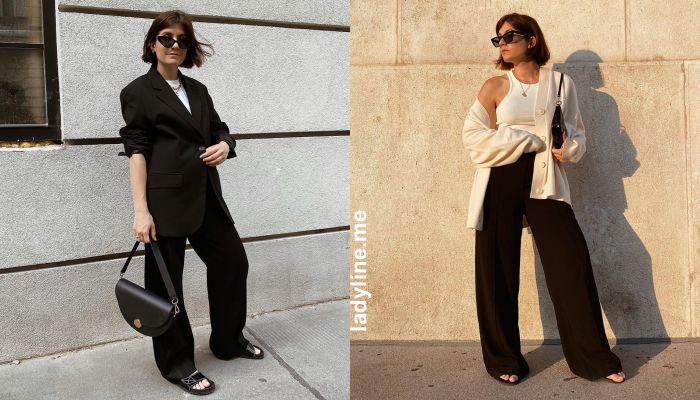 Монохромный брючный костюм черного цвета гармонично сочетается с белой футболкой, а также лаконичными сандалиями на плоской подошве.