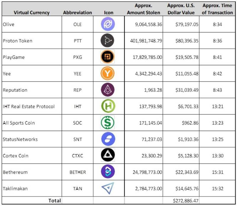 Указанные в иске кошельки якобы участвовали в отмывании денег, которыми хакеры завладели в ходе двух атак, произошедших в 2019 году. Первая атака произошла в июле: преступники тогда похитили более $272 тыс. в таких малоизвестных альтокинах, как Olive, Proton Token и PlayGame. Расследование показало, что эти деньги были отмыты путем конвертации токенов в другую криптовалюту.